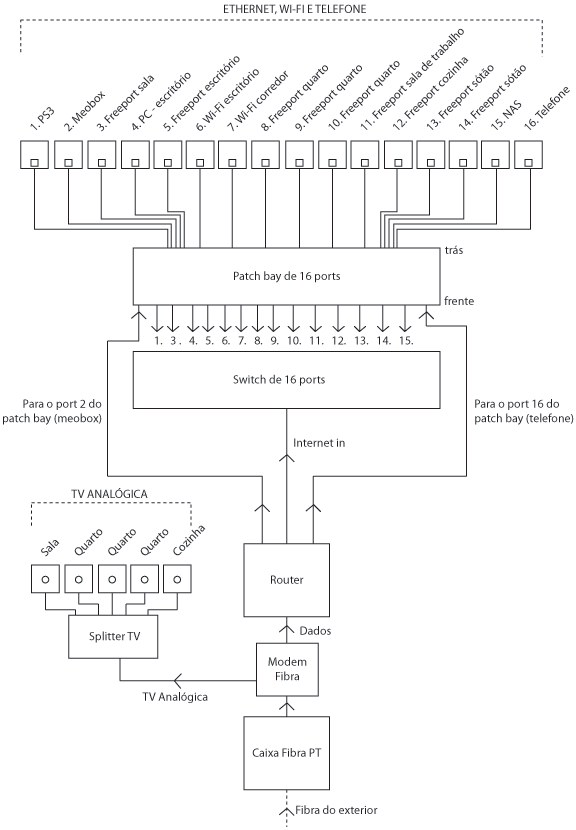 A esse armário deverá chegar toda a cablagem para ser ligada aos diversos equipamentos de gestão e distribuição de sinais; a ideia geral é mais ou menos esta: