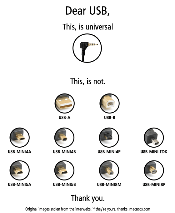 A mim, o que me irrita no USB, é dizer-se universal e depois ser esta macacada de formatos. Tenho um telefone novo, ia ligá-lo ao computador e pimba, o cabo USB que tinha já não dá, porque agora é Mini USB, variante nãsseiquê.